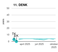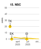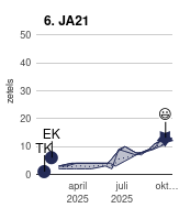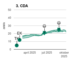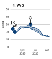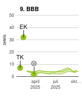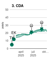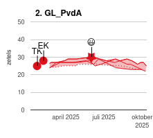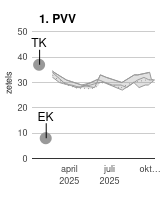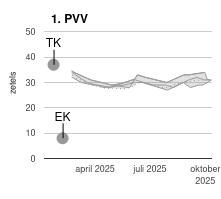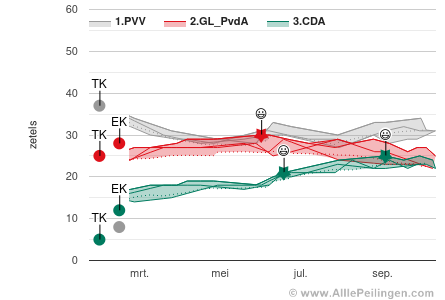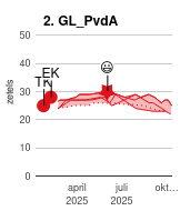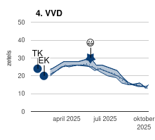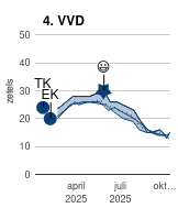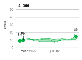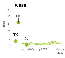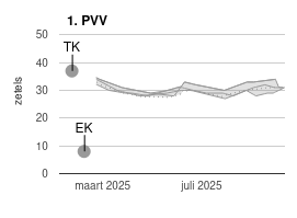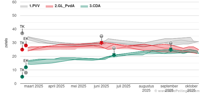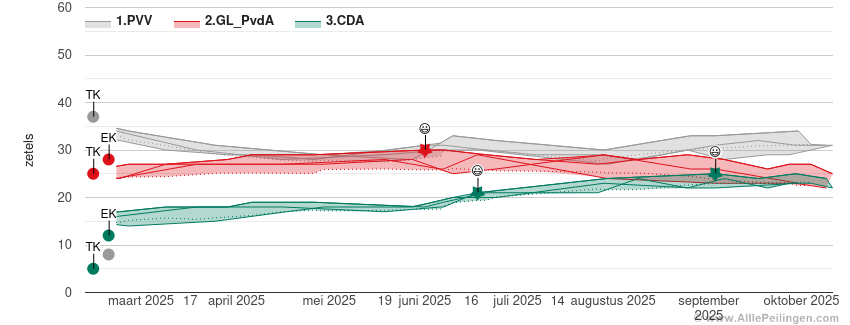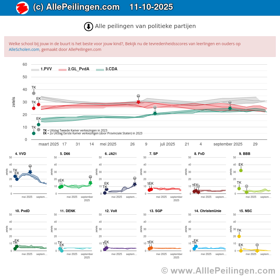 Alle politieke peilingen van zeven peilers worden in een grafiek vergeleken. Verzameld zijn de peilingen van onderzoeksbureau Verian, peil.nl van Maurice de Hond, de politieke barometer van Ipsos Synovate, I&O Research, De Stemming, LISS panel en NOS Peilingwijzer.