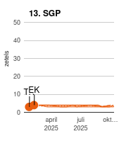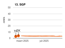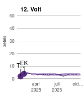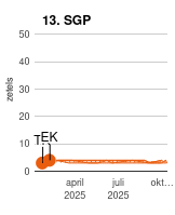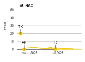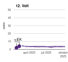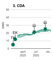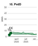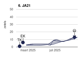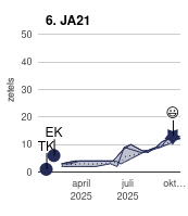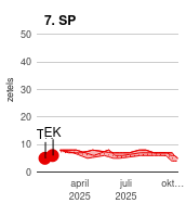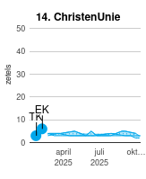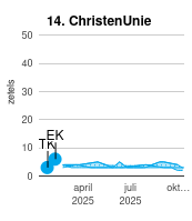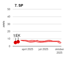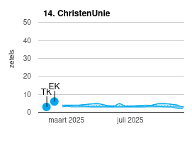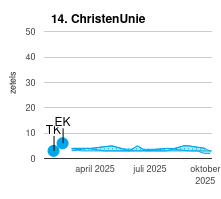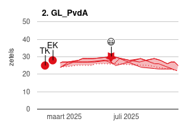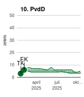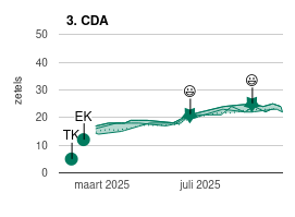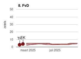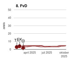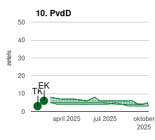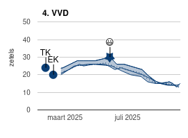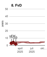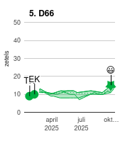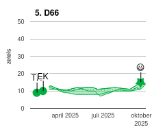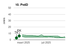 Er wordt een zogenaamde consolidated range van peilingen van de afgelopen 8 maanden getoond. De consolidated range wordt bepaald door het minimum en maximum van de diverse peilingen te bepalen. Tip voor als je verder wil terugkijken: klik in de grafiek op '' en je ziet een grafiek met alle peilingen en uitslagen van die partij vanaf 1964.