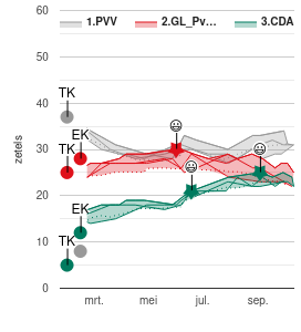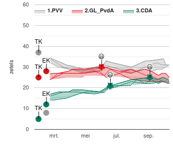 De uitslagen van de laatste Eerste Kamer (EK) en Tweede Kamer (TK) verkiezingen worden getoond. Deze worden met bullets weergegeven. Daarnaast worden op de verkiezingsavond exit polls en voorlopige verkiezingsuitslagen in de grafieken vermeld.