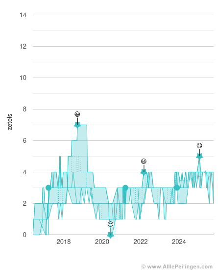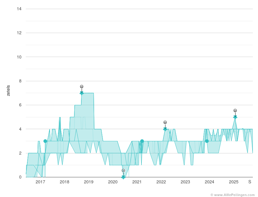 Er wordt een zogenaamde consolidated range van de afgelopen jaren getoond. De consolidated range wordt bepaald door het minimum en maximum van de diverse peilingen te bepalen. Tevens worden de uitslagen van de verkiezing getoond. Deze worden met bullets weergegeven. Met het scroll wheel van de muis kan worden ingezoomd. Met de rechtermuisknop kan worden uitgezoomd.
