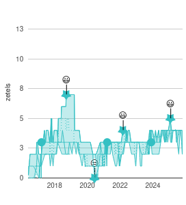 In een historische grafiek worden de zeven verschillende peilingen voor de DENK vanaf 2016 tot nu met elkaar vergeleken. Hierbij wordt gebruik gemaakt van peilingen van de volgende peilers: peil.nl van Maurice de Hond, Verian, de politieke barometer van Ipsos Synovate, I&O Research, De Stemming, LISS panel en NOS Peilingwijzer.