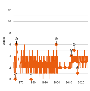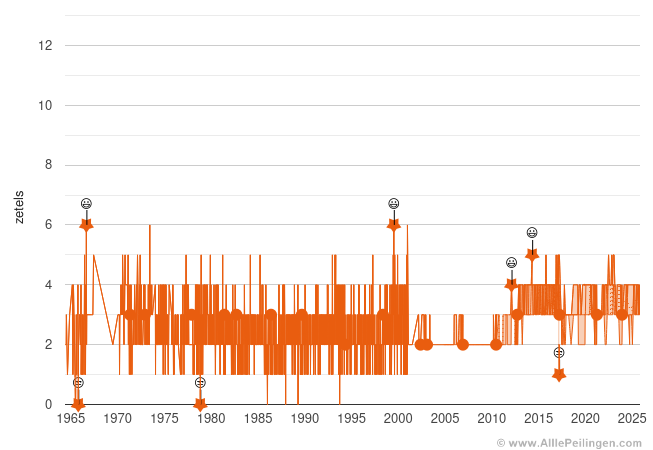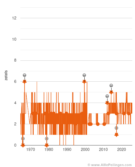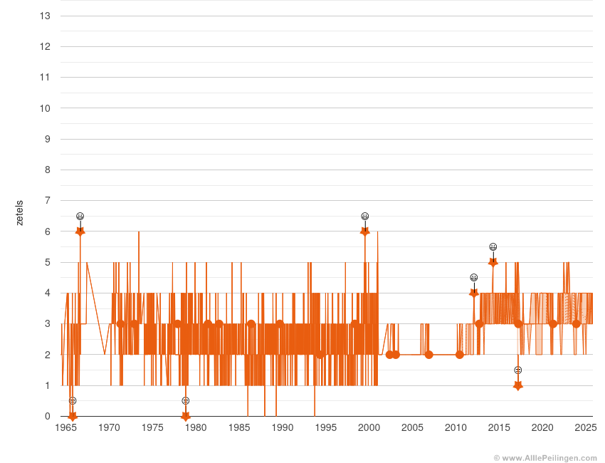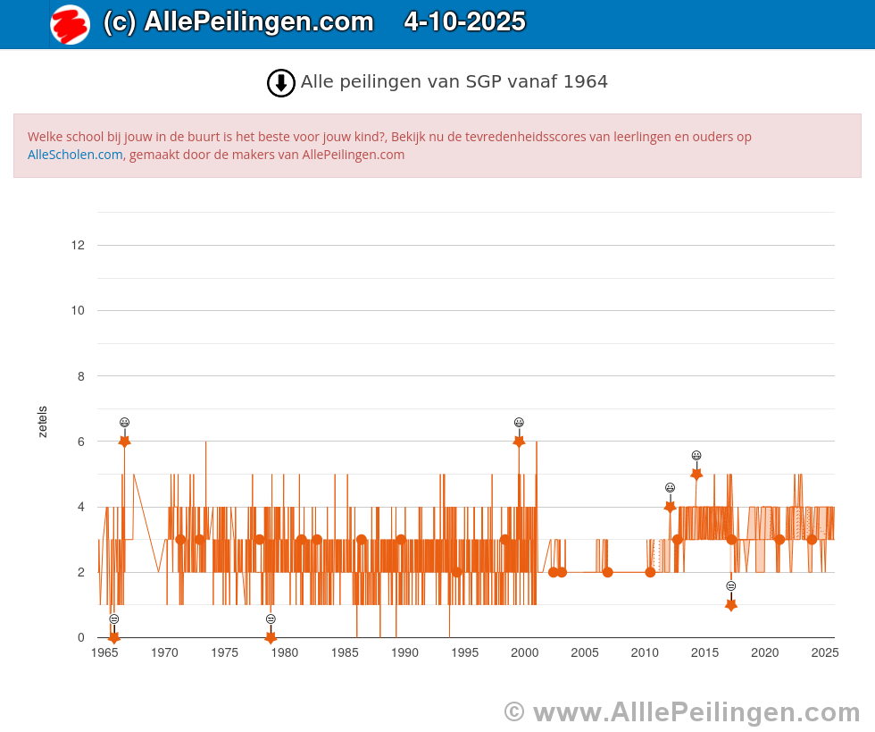 In een historische grafiek worden de zeven verschillende peilingen voor de SGP vanaf 1964 tot nu met elkaar vergeleken. Hierbij wordt gebruik gemaakt van peilingen van de volgende peilers: peil.nl van Maurice de Hond, Verian, de politieke barometer van Ipsos Synovate, I&O Research, De Stemming, LISS panel en NOS Peilingwijzer.