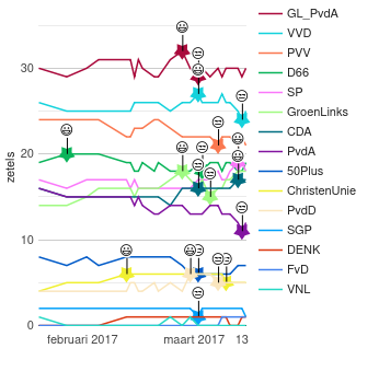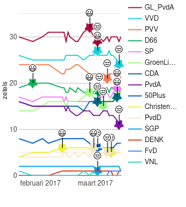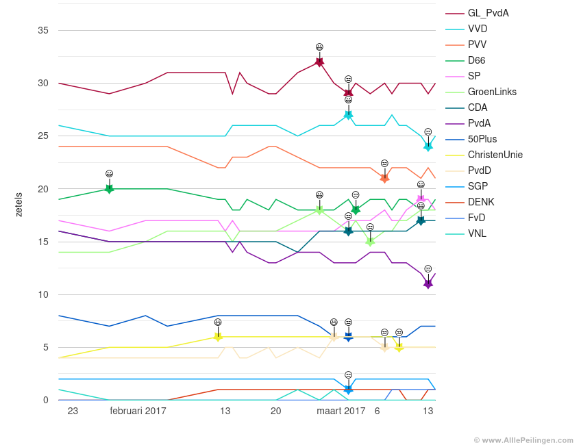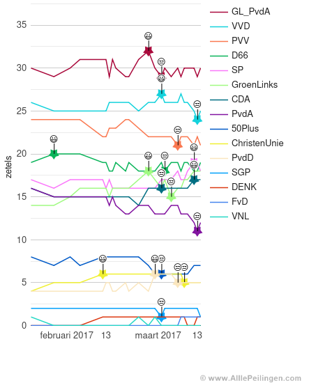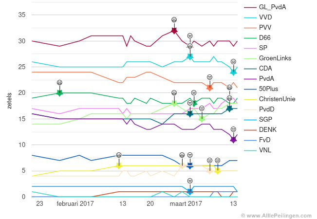 Alle politieke peilingen van de afgelopen twee jaar uitgevoerd door Het LISS Panel voor de diverse politieke partijen - VVD, PvdA, CDA, PVV, D66, SP, GroenLinks, Christen Unie, 50 Plus, SGP en Partij voor de Dieren (PvdD) - worden in een grafiek vergeleken.