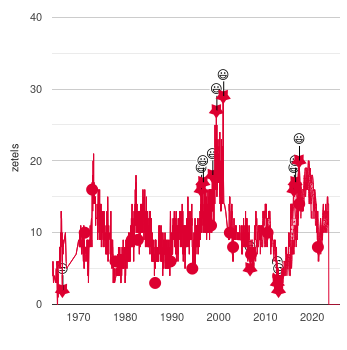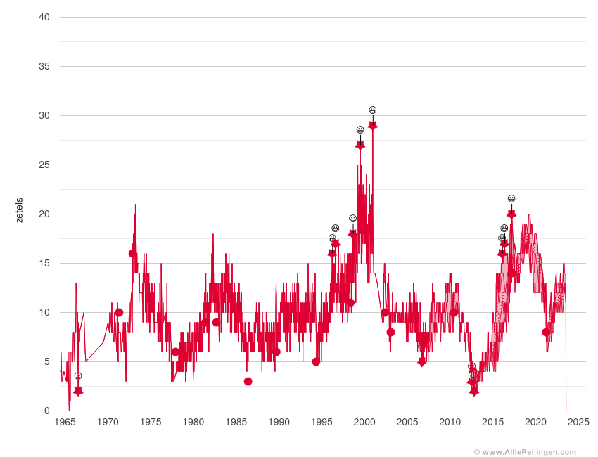 Er wordt een zogenaamde consolidated range van de afgelopen jaren getoond. De consolidated range wordt bepaald door het minimum en maximum van de diverse peilingen te bepalen. Tevens worden de uitslagen van de verkiezing getoond. Deze worden met bullets weergegeven. Met het scroll wheel van de muis kan worden ingezoomd. Met de rechtermuisknop kan worden uitgezoomd.