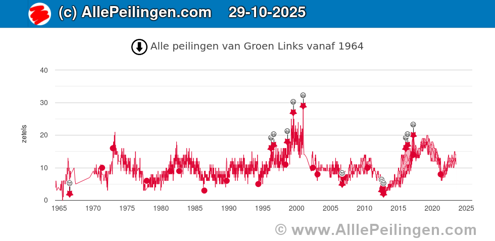In een historische grafiek worden de zeven verschillende peilingen voor GroenLinks vanaf 1964 tot nu met elkaar vergeleken. GroenLinks is in 1990 ontstaan uit een fusie van de partijen: PPR, PSP, CPN en EVP. Hierbij wordt gebruik gemaakt van peilingen van de volgende peilers: peil.nl van Maurice de Hond, Verian, de politieke barometer van Ipsos Synovate, I&O Research, De Stemming, LISS panel en NOS Peilingwijzer.