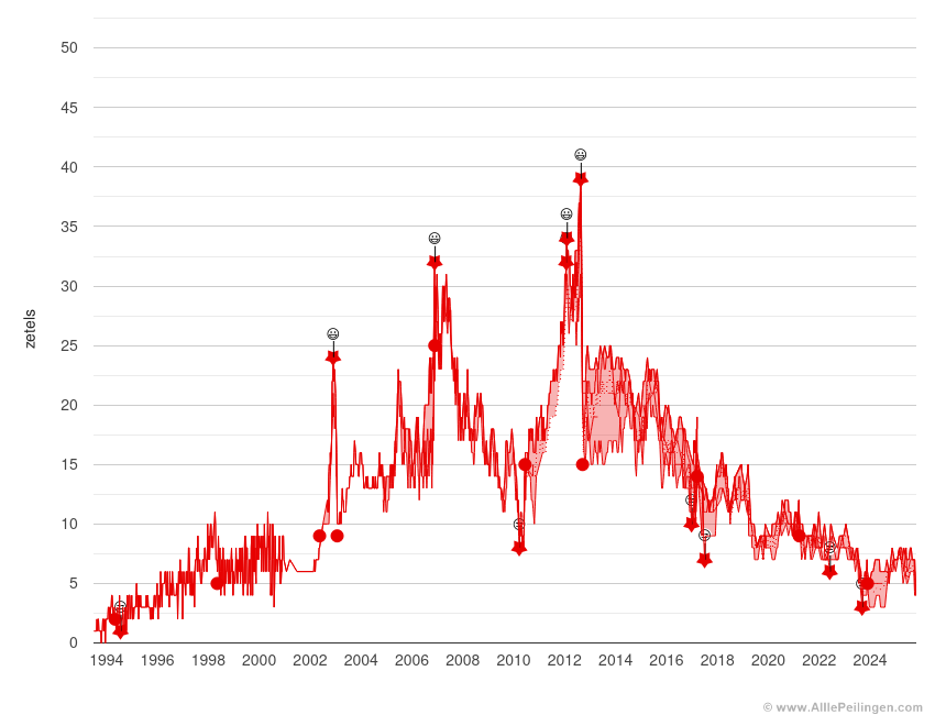 Er wordt een zogenaamde consolidated range van de afgelopen jaren getoond. De consolidated range wordt bepaald door het minimum en maximum van de diverse peilingen te bepalen. Tevens worden de uitslagen van de verkiezing getoond. Deze worden met bullets weergegeven. Met het scroll wheel van de muis kan worden ingezoomd. Met de rechtermuisknop kan worden uitgezoomd.