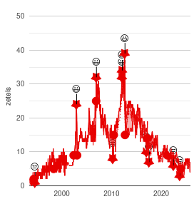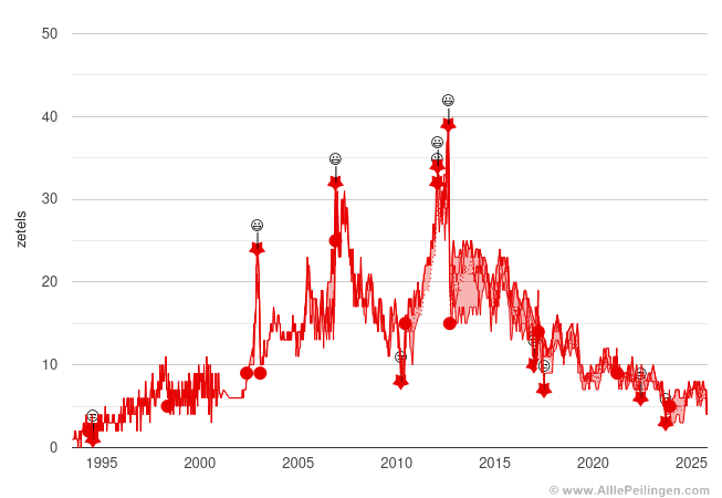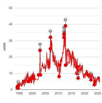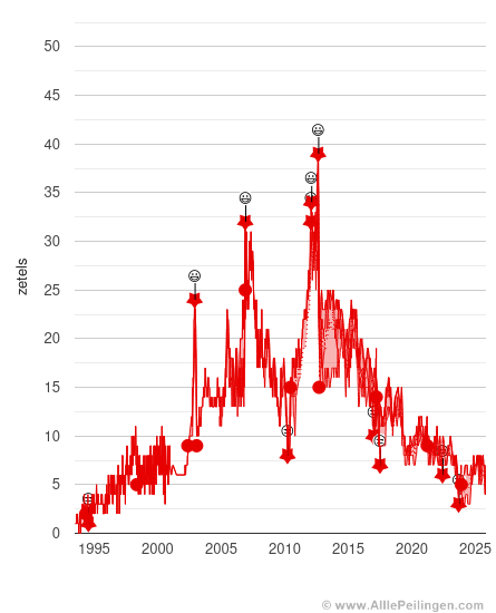In een historische grafiek worden de zeven verschillende peilingen voor de SP vanaf 1993 tot nu met elkaar vergeleken. Hierbij wordt gebruik gemaakt van peilingen van de volgende peilers: peil.nl van Maurice de Hond, Verian, de politieke barometer van Ipsos Synovate, I&O Research, De Stemming, LISS panel en NOS Peilingwijzer.
