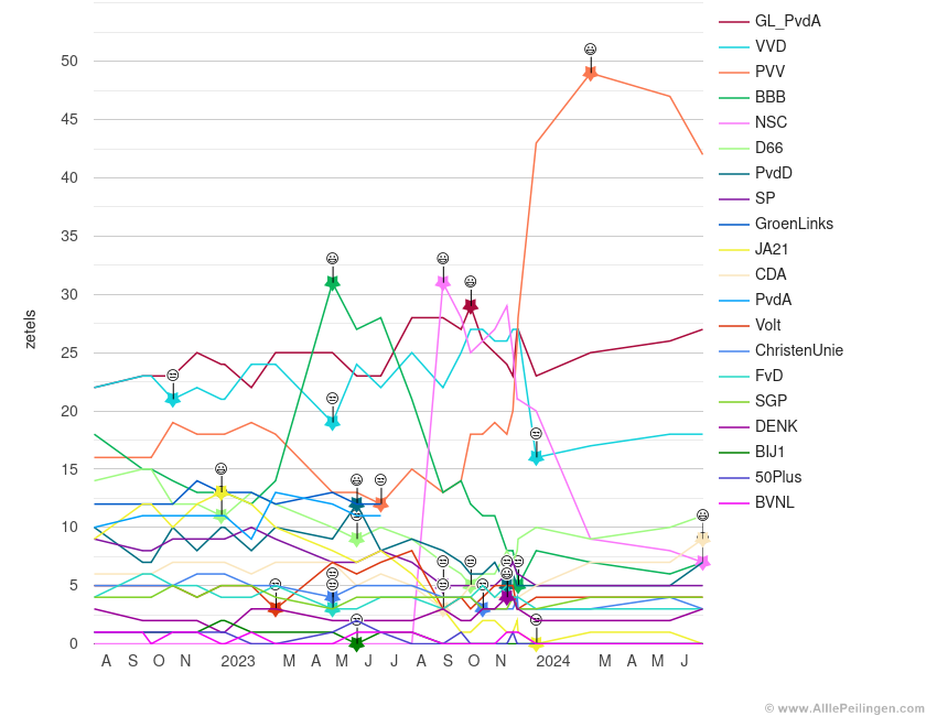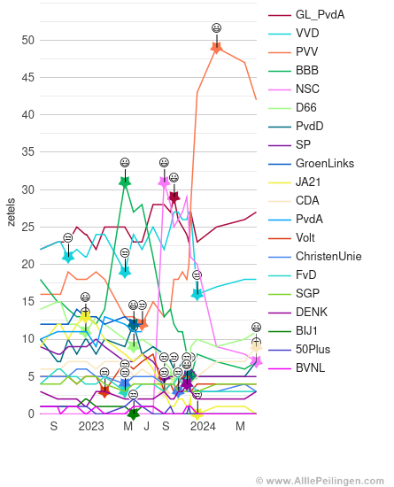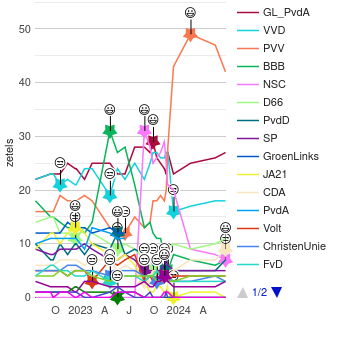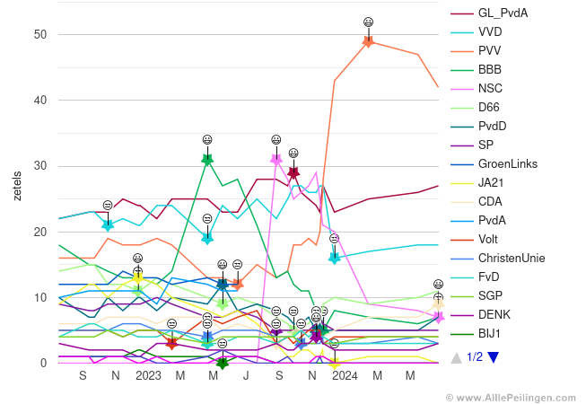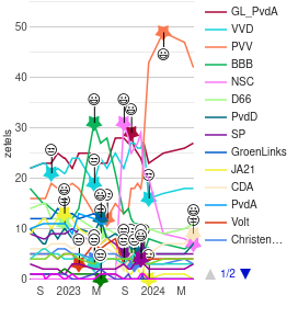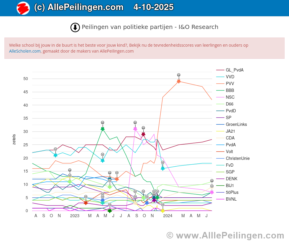 Alle politieke peilingen van de afgelopen twee jaar uitgevoerd door I&O Research voor de diverse politieke partijen - VVD, PvdA, CDA, PVV, D66, SP, GroenLinks, Christen Unie, 50 Plus, SGP en Partij voor de Dieren (PvdD) - worden in een grafiek vergeleken.
