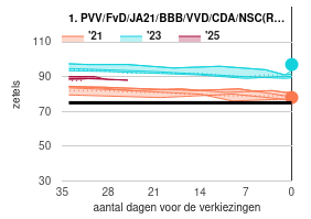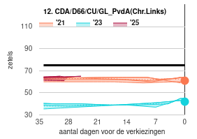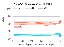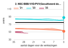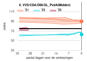 Er wordt een zogenaamde consolidated range getoond. De consolidated range wordt bepaald door het minimum en maximum van de diverse peilingen te bepalen. Tip voor als je verder wil terugkijken: klik in de grafiek op '' en je ziet een grafiek met alle coalities van de de laatste 3 maanden voorafgaand aan alle verkiezingen vanaf 2006.