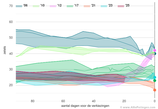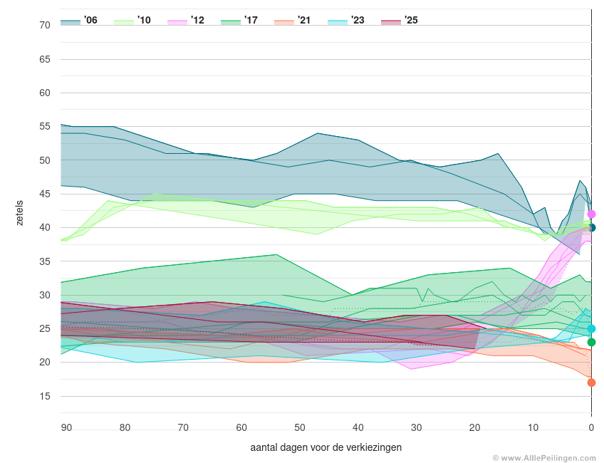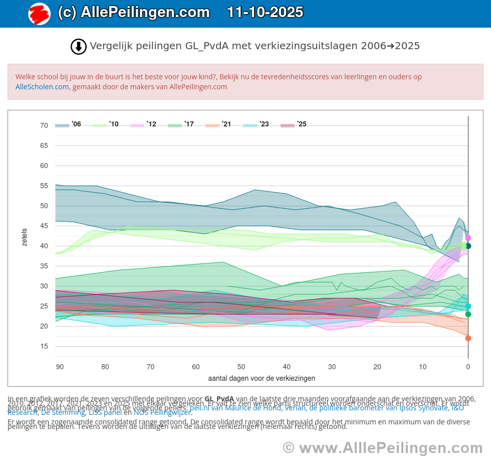 In een grafiek worden de zeven verschillende peilingen voor GL_PvdA van de laatste drie maanden voorafgaande aan de verkiezingen van 2006, 2010, 2012, 2017, 2021, 2023 en 2025 met elkaar vergeleken. Er valt te zien welke partij structureel worden onderschat en overschat. Er wordt gebruik gemaakt van peilingen van de volgende peilers: peil.nl van Maurice de Hond, Verian, de politieke barometer van Ipsos Synovate, I&O Research, De Stemming, LISS panel en NOS Peilingwijzer.
