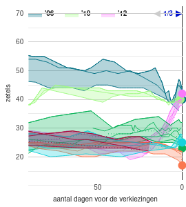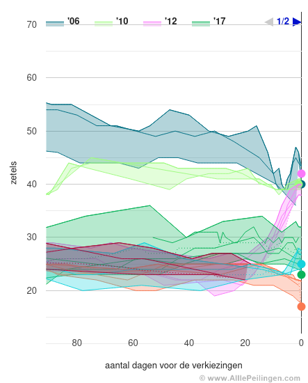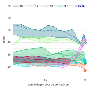 Er wordt een zogenaamde consolidated range getoond. De consolidated range wordt bepaald door het minimum en maximum van de diverse peilingen te bepalen. Tevens worden de uitslagen van de laatste verkiezingen (helemaal rechts) getoond.
