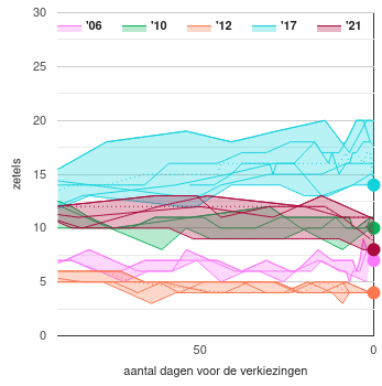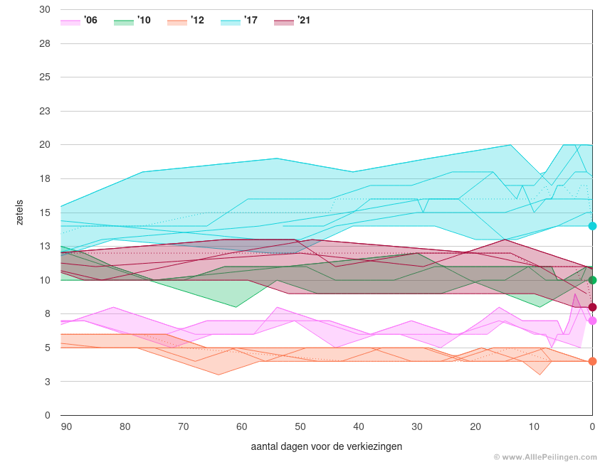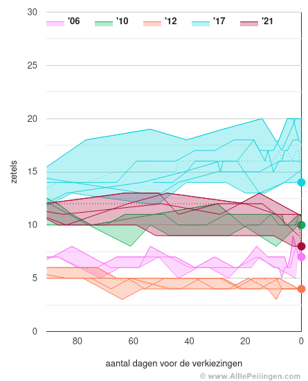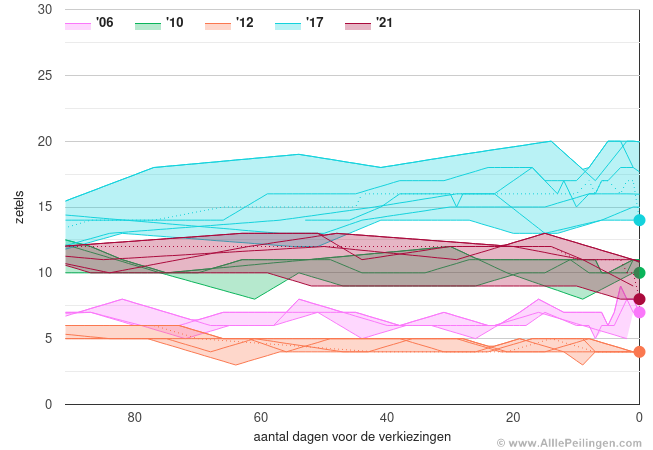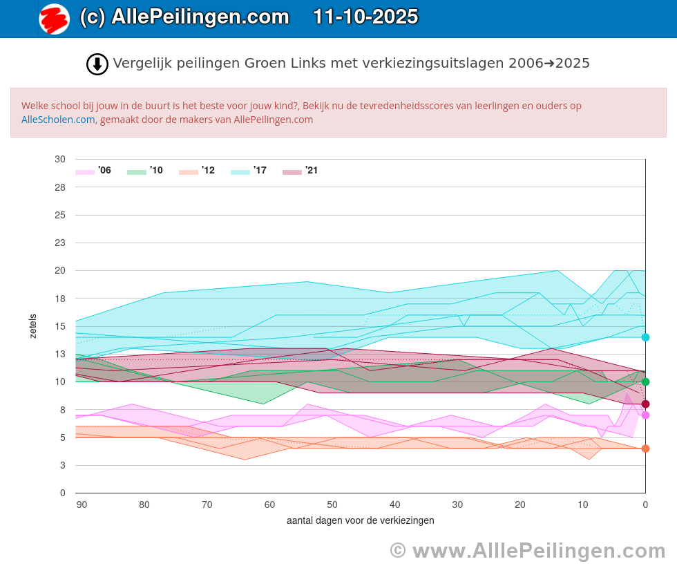 In een grafiek worden de zeven verschillende peilingen voor de GroenLinks van de laatste drie maanden voorafgaande aan de verkiezingen van 2006, 2010, 2012, 2017 en 2021 met elkaar vergeleken. Er valt te zien welke partij structureel worden onderschat en overschat. Er wordt gebruik gemaakt van peilingen van de volgende peilers: peil.nl van Maurice de Hond, Verian, de politieke barometer van Ipsos Synovate, I&O Research, De Stemming, LISS panel en NOS Peilingwijzer.