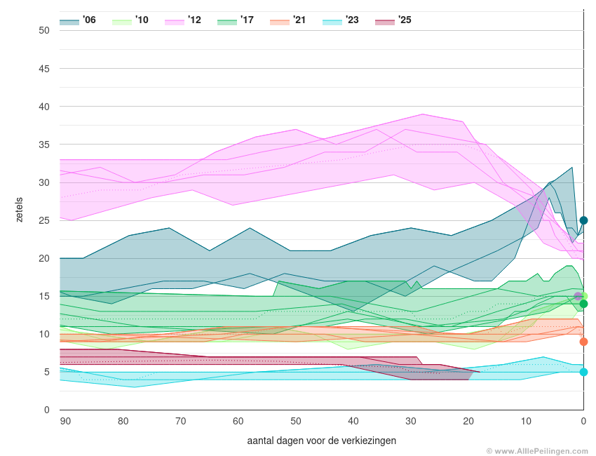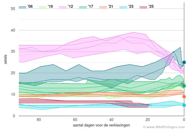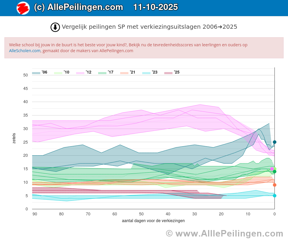 In een grafiek worden de zeven verschillende peilingen voor de SP van de laatste drie maanden voorafgaande aan de verkiezingen van 2006, 2010, 2012, 2017, 2021, 2023 en 2025 met elkaar vergeleken. Er valt te zien welke partij structureel worden onderschat en overschat. Er wordt gebruik gemaakt van peilingen van de volgende peilers: peil.nl van Maurice de Hond, Verian, de politieke barometer van Ipsos Synovate, I&O Research, De Stemming, LISS panel en NOS Peilingwijzer.