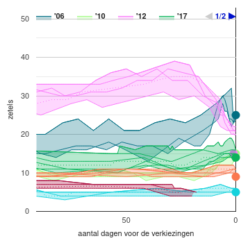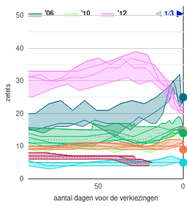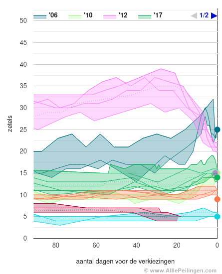 Er wordt een zogenaamde consolidated range getoond. De consolidated range wordt bepaald door het minimum en maximum van de diverse peilingen te bepalen. Tevens worden de uitslagen van de laatste verkiezingen (helemaal rechts) getoond.