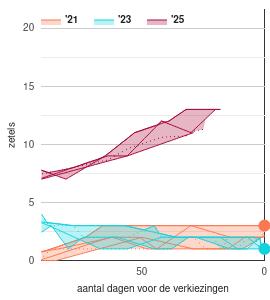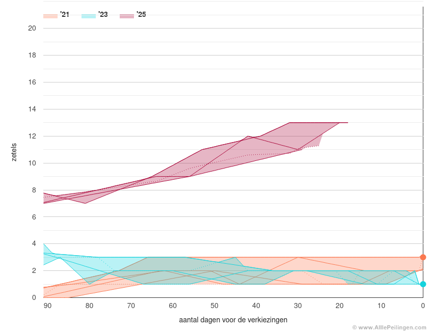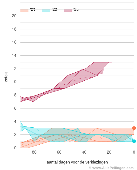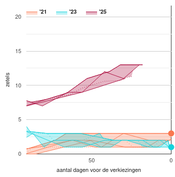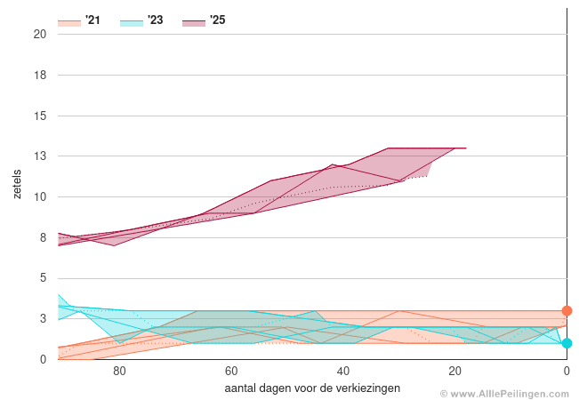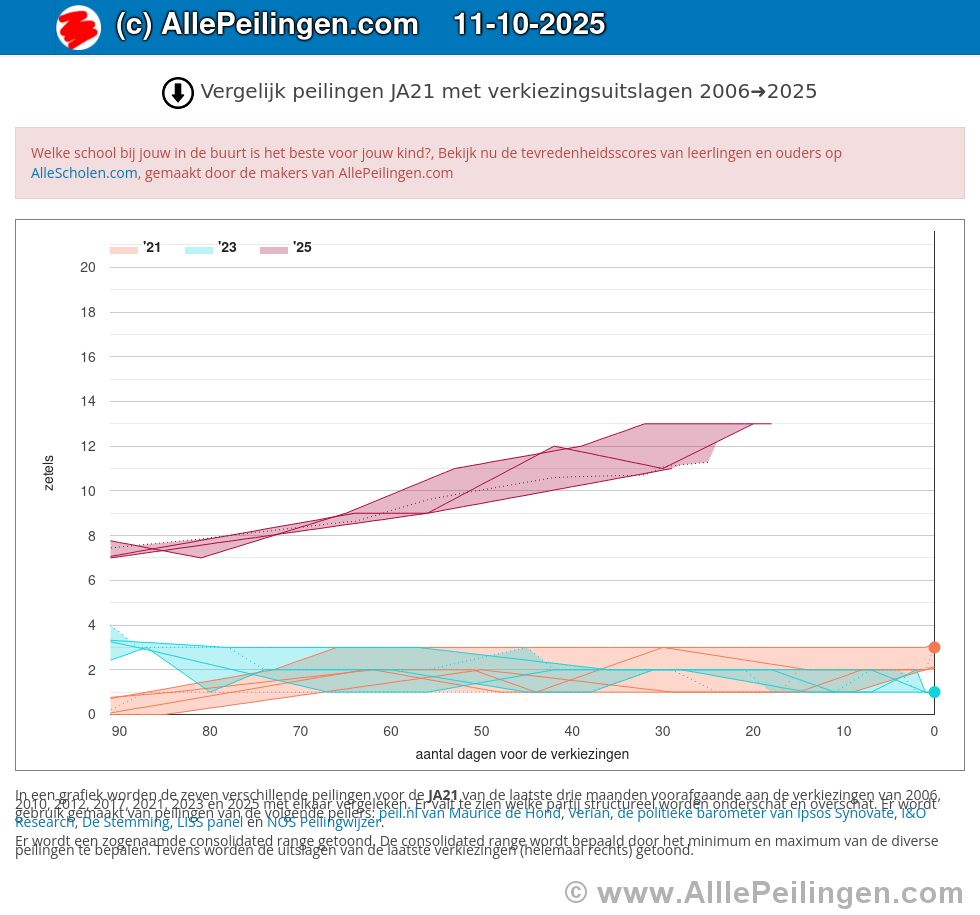 In een grafiek worden de zeven verschillende peilingen voor de JA21 van de laatste drie maanden voorafgaande aan de verkiezingen van 2006, 2010, 2012, 2017, 2021, 2023 en 2025 met elkaar vergeleken. Er valt te zien welke partij structureel worden onderschat en overschat. Er wordt gebruik gemaakt van peilingen van de volgende peilers: peil.nl van Maurice de Hond, Verian, de politieke barometer van Ipsos Synovate, I&O Research, De Stemming, LISS panel en NOS Peilingwijzer.